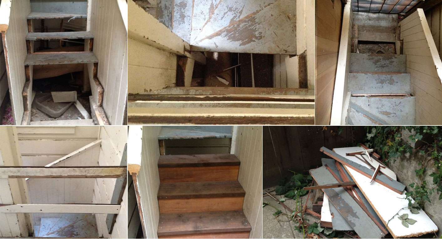 Here are some lovely pictures of my partially demolished stair case. I came home to this lovely surprise after a long day at work. Once again, I had to buzz all my neighbors until someone picked up. I had to explain the situation, let myself into their homes so that I could exit through their backdoor, from which I could access my apartment. Notice the bottom left picture. This is considered a "finished" job, despite missing planks here and there. Fun!!